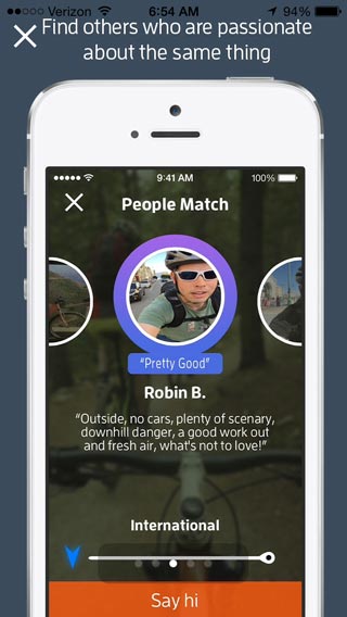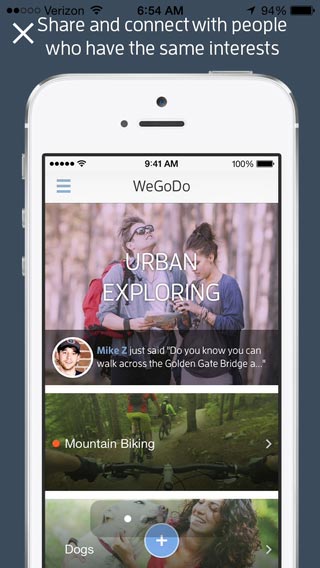 WeGoDo is merging proximity and outdoor sports. You tell WeGoDo what your interests are (mountain biking, climbing, running) and they match you up with other people in the area. It also shows the skill level of your matches so you can weed out the chumps.